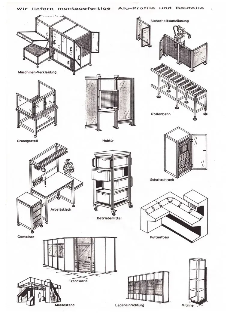Maschinen-Grundgestelle und Verkleidungen, Systemarbeitsplätze, Montage- und Förderlinien, Versuchsaufbau (Laboreinrichtungen), Foschungsmodelle und Testanlagen, Reinraum-Einhausungen, Rollengestelle und Transportwagen, Schallschutzkabinen.